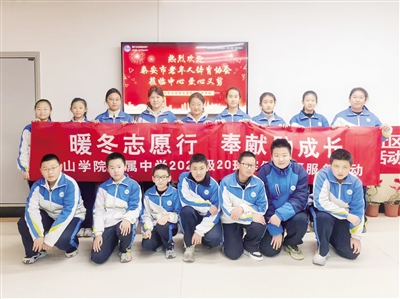 本报2月25日讯(记者 杨丽宁 通讯员 周娜)春节前夕,泰山学院附属中学2024级20班学生走进泰山区财源街道财西社区“寿比泰山”养老服务中心,开展以“暖冬志愿行 奉献助成长”为主题的敬老助老志愿服务活动,深入弘扬“奉献、友爱、互助、进步”的志愿精神。
