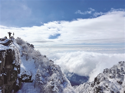 泰山之巅,雪凇、雾凇挂满枝头,石牌坊、石阶步道被冰雪装点得晶莹剔透。从极顶远眺,云海翻涌,如棉絮般铺展在山谷间,山峰在云雾中若隐若现,石坊、石狮、古建皆披银装,宛如天上宫阙。