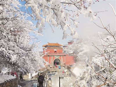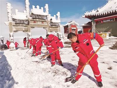 为保障游客出行安全,泰山景区工作人员在天街、十八盘等重点区域开展除冰扫雪作业,确保登山通道畅通。红衣映白雪,成为雪后泰山一道温暖而亮丽的风景线。