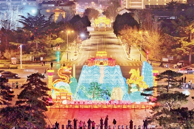 夜幕之下,灯火璀璨如画,市民游客徜徉灯海,赏灯游园,欢度佳节,在浓郁氛围中感受泰山文化与新春年味。