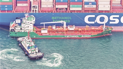 3月2日,在山东港口青岛港,甲醇加注船“建航利达”轮为一艘货轮进行绿色甲醇“船对船”加注作业(无人机照片)。 3月3日,山东港口青岛港完成首批两艘国际航行船舶绿色甲醇“船对船”加注作业。此次作业全程不影响码头正常生产,实现了“边作业、边加注”的突破。这标志着青岛港正式成为北方首个实现常态化绿色甲醇加注服务的港口。 新华社发