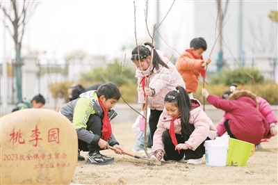 3月11日,学生在江苏省海安市南屏小学参加植树活动。 植树节来临,各地开展植树活动,为大自然增添新绿,助力生态保护,共建美丽家园。 新华社发