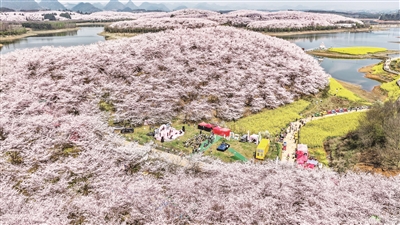 3月11日,游客在贵州省贵安新区樱花园内游玩(无人机照片)。 近日,随着气温回升,贵州省贵安新区樱花园内的2.4万亩樱花迎来盛花期。如云似霞的樱花和山川、湖泊、民居构成一幅幅美丽的春日画卷,吸引众多游客前来观光游玩。 新华社发