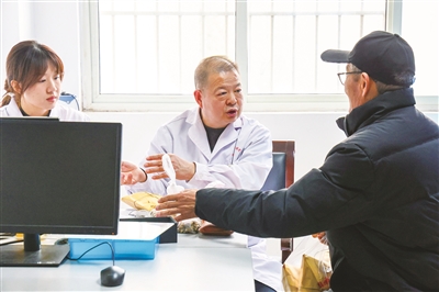 3月16日,在滕州市姜屯中心卫生院,来自市妇幼保健院的主治医师李贞文(中)叮嘱患者服药注意事项。