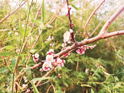 漫步彩石溪,褐红色的枝杈间,杏花花苞裹着细碎绒毛,在气温渐暖后尽情舒展。阳光穿透轻薄的花瓣,金黄花蕊随风轻颤。微风拂过,花瓣簌簌飘落,铺就一条素雅花径。