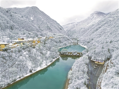 3月18日拍摄的官鹅沟景区雪景(无人机照片)。 临近春分节气,甘肃省陇南市宕昌县出现降雪,春雪将官鹅沟景区装扮得银装素裹,白雪覆盖下的树木、湖泊和村庄共同构成一幅美丽画卷。