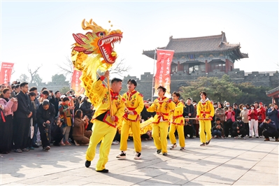 活动现场氛围热烈,铿锵的锣鼓声中,舞龙、舞狮等传统民俗表演轮番上演,鼓乐舞蹈《马到成功 国泰民安》传递出“二月二龙抬头、马年登泰山”的吉祥寓意。