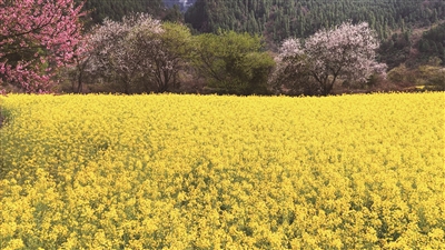 3月20日在西藏林芝市波密县易贡乡拍摄的油菜花与桃花(无人机照片)。 易贡油菜花田位于西藏林芝市波密县易贡乡。近期,连片油菜花竞相开放,桃花也缀满枝头,与远山相互映衬,构成一幅高原田园画卷。新华社发