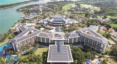 在博鳌零碳示范区拍摄的博鳌亚洲论坛国际会议中心和博鳌亚洲论坛大酒店屋顶的光伏设备(3月19日摄,无人机照片)。 自2025年3月“博鳌近零碳示范区”更名为“博鳌零碳示范区”以来,示范区节能降碳成效显著,已全面进入常态化“零碳运行”阶段。据实测数据显示,2025年博鳌零碳示范区建筑和市政基础设施能源相关二氧化碳排放量已从2019年的11350.1吨降至约14.6吨,实现减碳99.9%。示范区全年生产绿电2900万度,既满足示范区每年约1940万度的用电需求,又可将剩余960万度绿电上网。 新华社发