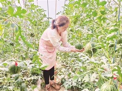 上市在即,管护更需精细。棚内技术员正蹲在垄间仔细察看西瓜长势。“眼下西瓜进入膨果期,正是品质形成的关键期,温度控制是重中之重。”他介绍,“西瓜喜温,白天28℃到35℃最合适。这几天我们一天多跑几趟,勤观察,提醒种植户勤调整风口,既要防高温烧苗,也要防低温裂果,还得注意有没有细菌性病害,确保上市的瓜个个都是精品。”