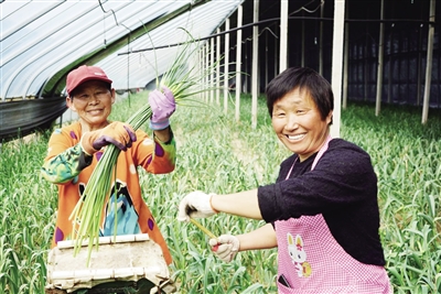 ■种植户在大棚中采收蒜薹。通讯员供图
