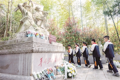 4月2日,浙江省湖州市长兴县龙山街道革命烈士陵园,来自该县实验小学的学生在纪念碑前敬献鲜花。 清明节前夕,全国多地通过各种形式缅怀英烈,致敬英雄。 新华社发