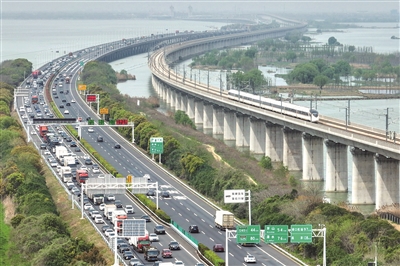 4月6日,车辆在沪武高速江苏常州段行驶(无人机照片)。 记者6日从交通运输部获悉,今年清明假期(4月4日至6日),公路人员流动量预计为77845万人次,日均预计为25948万人次,同比增长5.8%。