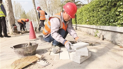 本报4月7日讯(记者 董文一)清明假期,温泉路(金域缇香小区西门以北、南湖大街以南)东侧人行道上,几位身着橙色马甲的施工人员蹲伏在道板间,熟练地将一块块松动翘起的道板起出、更换、加固。锤錾敲击声与春风交织,为假日街区增添了几分忙碌而温暖的节奏。