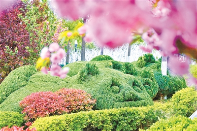 4月8日,记者步入岱道庵游园,沿北侧环湖步道东行,循一处北向上行台阶望去,在西侧萌趣乐园里,3只憨态可掬的“熊猫”悠然卧于绿意之中,这是游园精心打造的植物造型作品“熊猫一家”。不远处,南瓜罐植物造型同样妙趣横生、圆润饱满,与蓝天碧水、红花绿柳相映成趣。