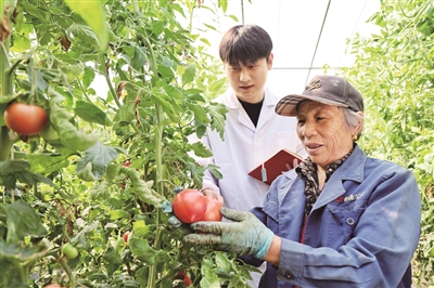 山东农业大学研究生与村民一同察看番茄长势。