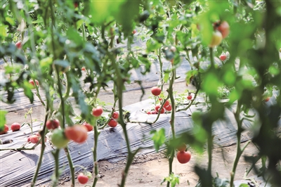 在泰山区上高街道魏家庄村的上高庄园里,一排排冬暖式大棚鳞次栉比。番茄种植大棚里,两米多高的番茄藤蔓顺着吊蔓架生长,绿叶间挂满了青红相间的果实。鲜红的番茄汁水丰盈、沙瓤饱满,果香扑面而来。